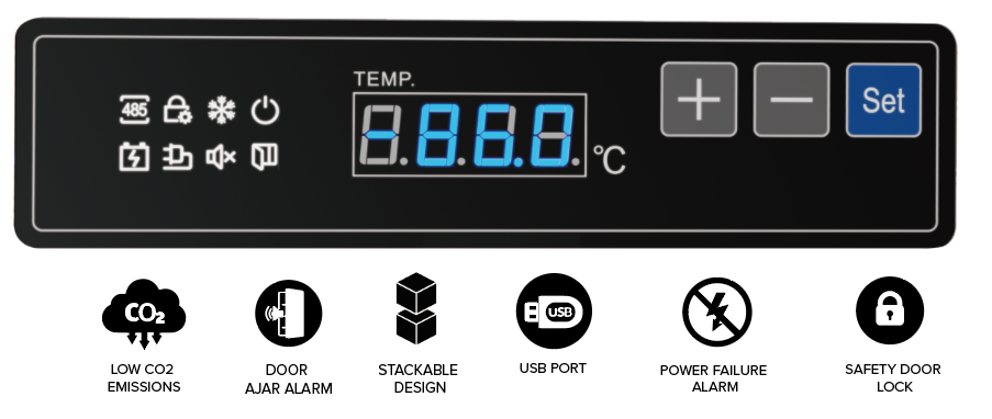 Microprocessor electronic controller TC-300A, fitted with dual LED screen to display inner chamber temperature and key working conditions. Advanced dual sensor control system for accurate temperature control.