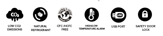 Multiple alarms: High/low temperature, power failure, sensor error, door ajar, low voltage in backup battery, hot condenser, high/low voltage alarm, high ambient temperature alarm