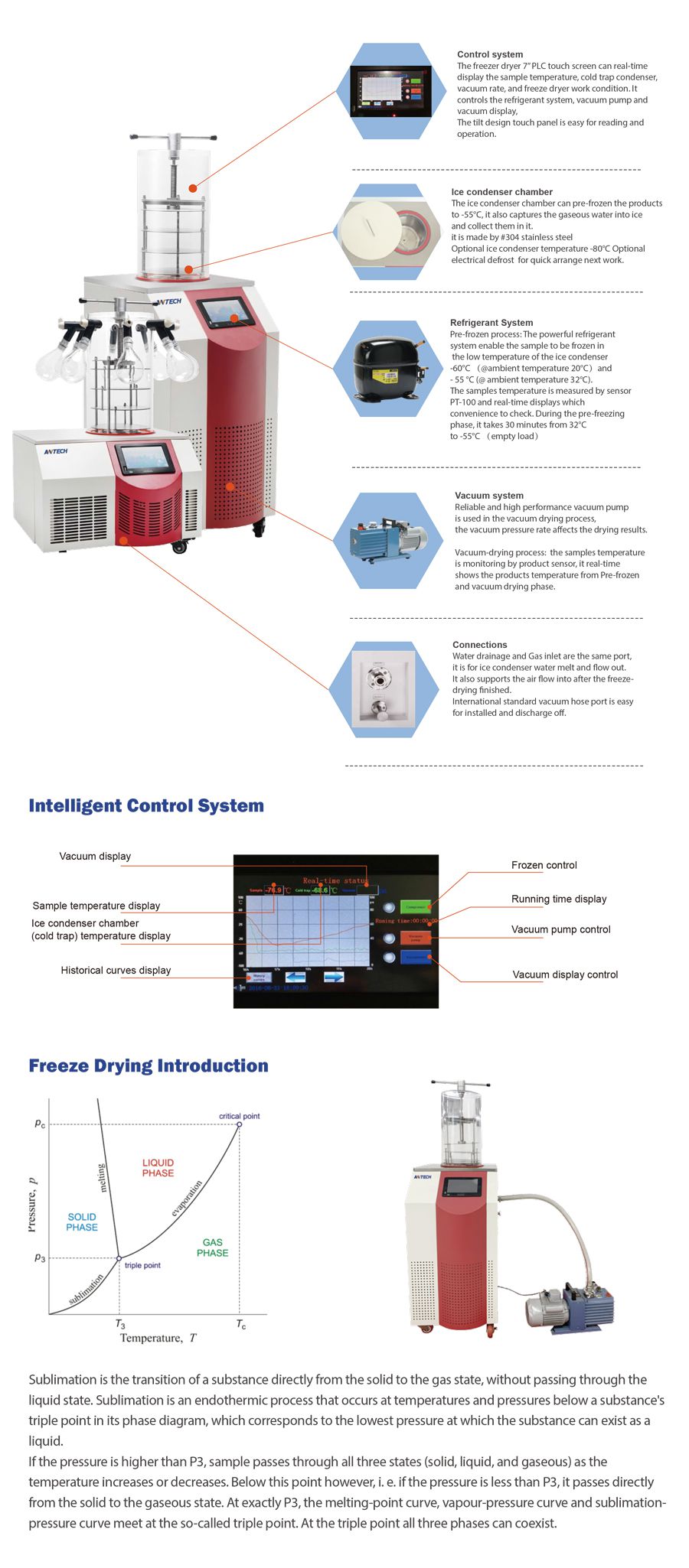 The freeze-dryer has been exclusively designed for the freeze-drying of solid or liquid products in ampoules, vials or dishes. The freeze-dryer is suitable for freeze-drying solid substances and aqueous solutions (e.g. bacteria and virus cultures, blood plasma, serum fractions, antibodies, sera, vaccines and pharmaceutical products such as chloramphenicol, streptomycin, vitamins, ferments and plant extracts for biochemical tests). The freeze dryer is mainly used in industries such as biomedicine, chemical industry, food and environmental testing.