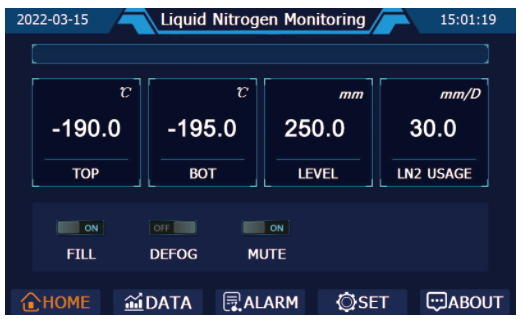 The liquid level monitoring system based on high-precision differential pressure sensor displays the liquid level in real time to ensure the safety and reliability of the automatic filling of liquid nitrogen. The color touch screen can display: top temperature, bottom temperature, liquid level height, daily liquid nitrogen consumption and other parameters.