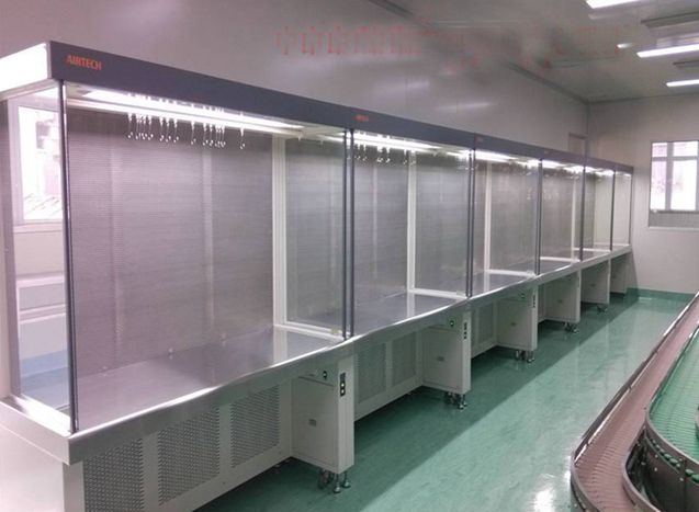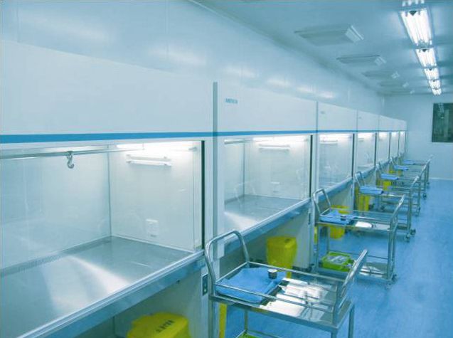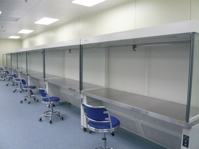 A laminar flow cabinet (clean bench) or tissue culture hood is a carefully enclosed bench designed to prevent contamination of semiconductor wafers, biological samples, or any particle sensitive materials. Air is drawn through a HEPA filter and blown in a very smooth, laminar flow towards the user. The cabinet is made of stainless steel with no gaps or joints where spores might collect.