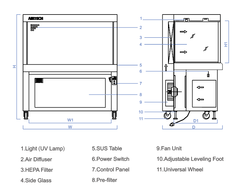 Horizontal laminar flow cabinet direct HEPA-filtered 99.99% (@0.3μm)air horizontally over the work area to provide ISO Class 5 (formerly Class 100) conditions and protect your work from particulate contamination. Apply in plant tissue culture, media plate preparation, electronics inspection, medical device assembly and pharmacy drug preparation.