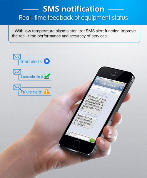 The first plasma sterilizer in the world to have the function of text message notification informs the operator of running status, the sterilization start and finish time, equipment fault and maintenance, etc.